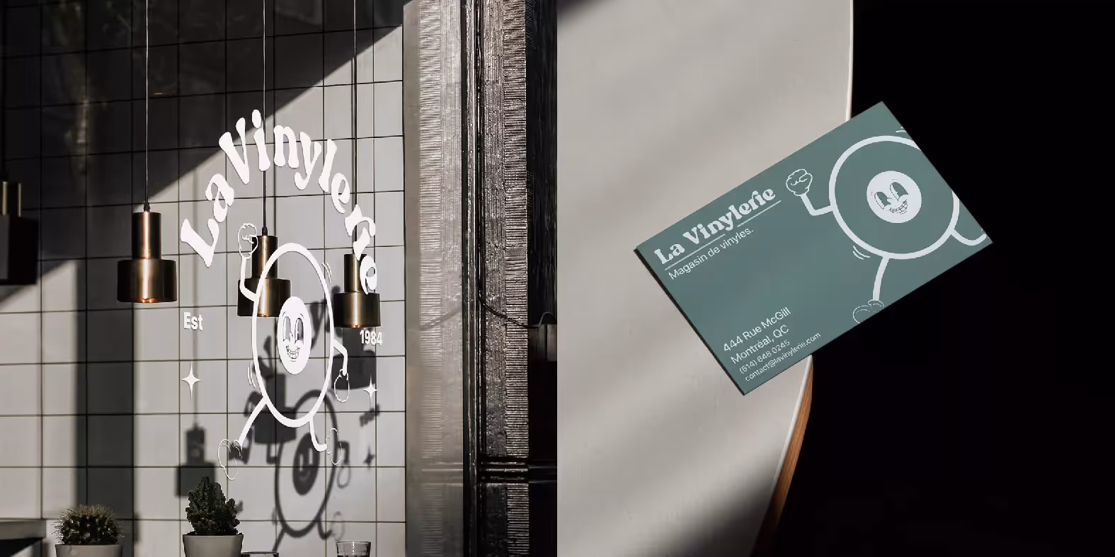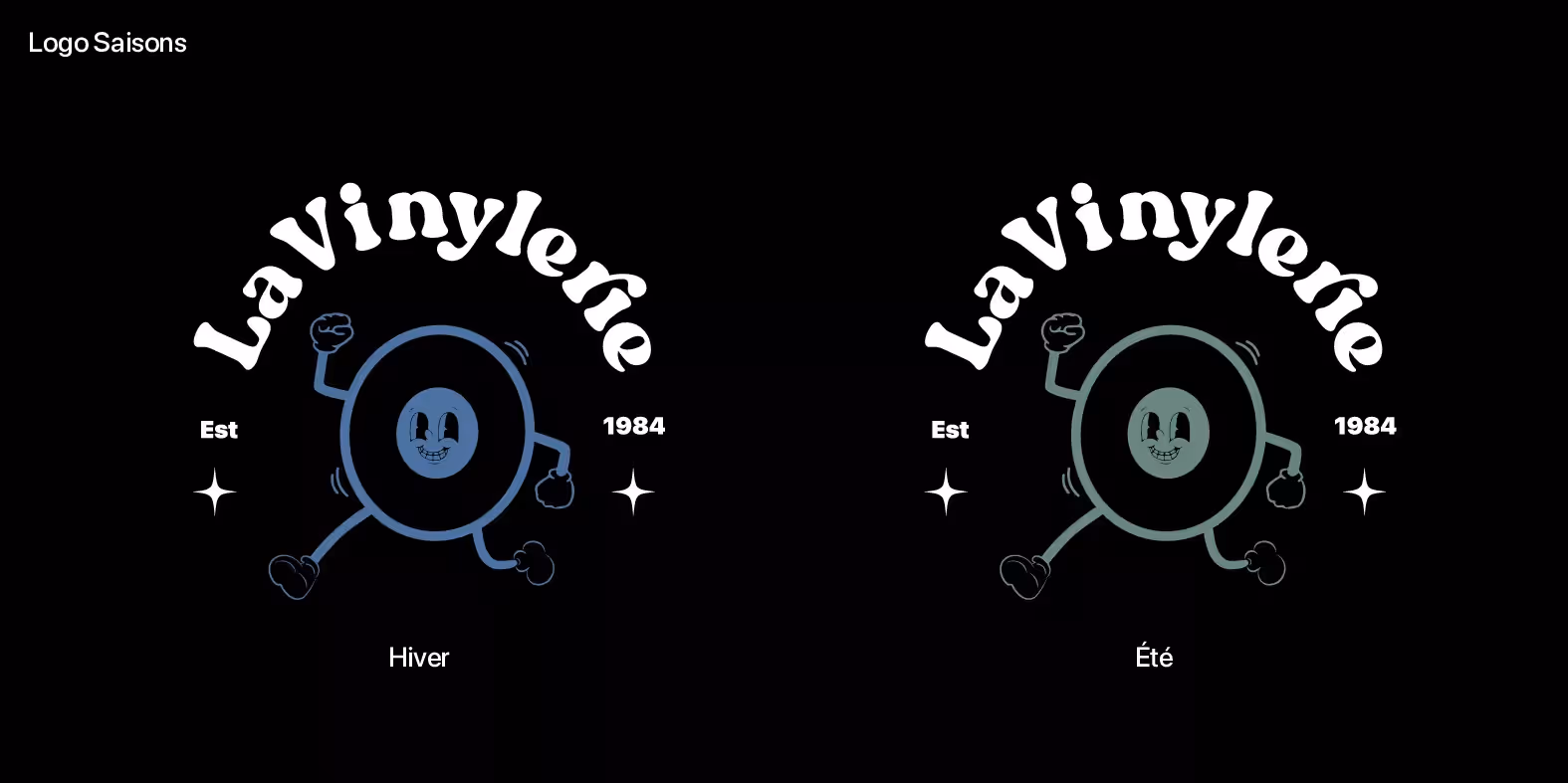 Pour le logo de La Vinylerie, l'inspiration provient des éléments vintage et contemporains liés à la culture du vinyle. La forme principale est un vinyle anthropomorphisé, exprimant la joie et le dynamisme à travers son sourire éclatant et ses membres en mouvement, ce qui évoque la vitalité de la musique. Les couleurs noir et blanc, avec des nuances de bleu et vert pour les variations saisonnières, renvoient à la simplicité classique des vinyles et aux changements de saisons, respectivement. La typographie rappelle les enseignes rétro des magasins de disques, et les étoiles symbolisent l'excellence et la qualité. L'ensemble s'inspire des moodboards, qui présentent des éléments rétro comme des tourne-disques et des illustrations de vinyles, tout en introduisant une touche de modernité avec des designs épurés. Le personnage du vinyle est centré, attirant immédiatement le regard, symbolisant le produit au cœur de l'entreprise – le disque vinyle. Autour de cette figure centrale, le nom 'La Vinylerie' est disposé en arc de cercle en haut, reflétant la forme circulaire du vinyle et renforçant l'identité de la marque. Sur Illustrator, la création du logo a été réalisée par vectorisation, ce qui assure la netteté des lignes et la facilité de redimensionnement sans perte de qualité. J'ai opté pour un dessin libre pour capturer l'essence du concept original, tout en utilisant la fonction Pathfinder pour fusionner et manipuler les formes. Les lignes guides ont servi à aligner les éléments et à maintenir l'équilibre visuel.